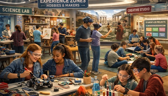 A visionary blueprint for a modern educational system where project-based learning replaces traditional testing. The concept introduces 'Experience Zones' for hobbies, VR-integrated history lessons, and a flexible curriculum that prioritizes student agency and hands-on science exploration.